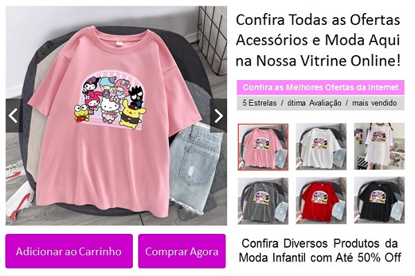 Camiseta Manga Curta Com Padrão Kuromi HelloKitty Desenho Animado.